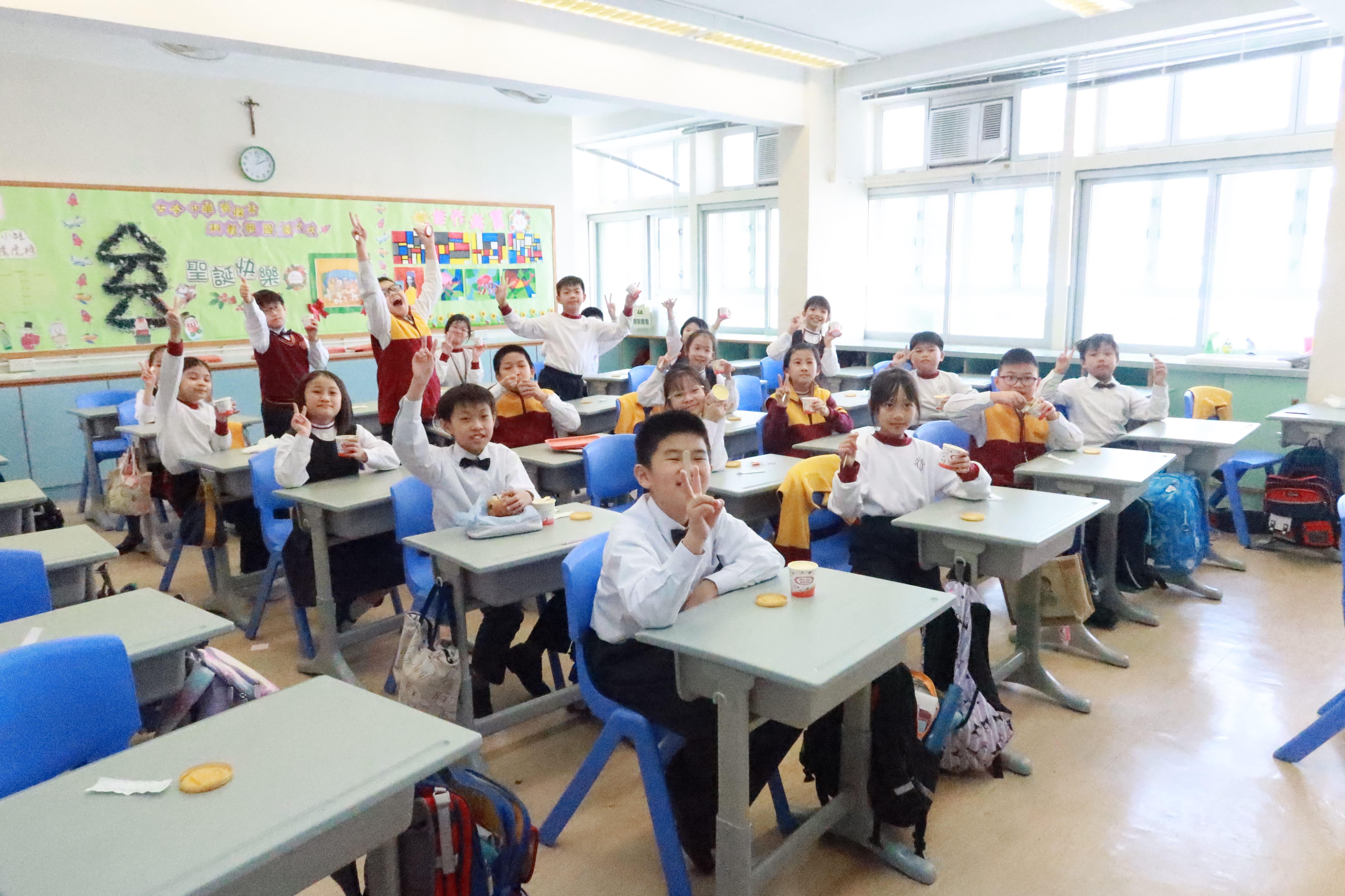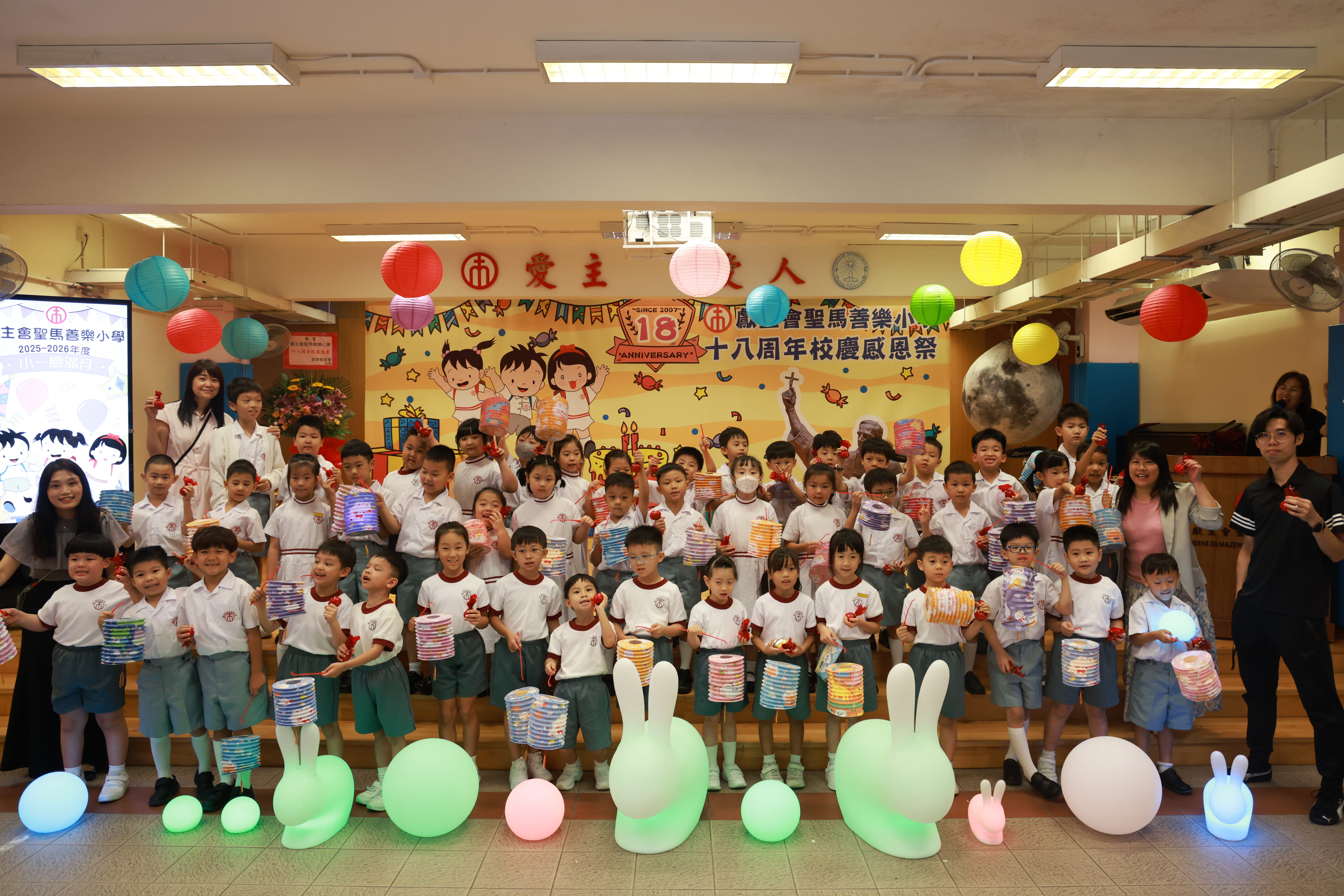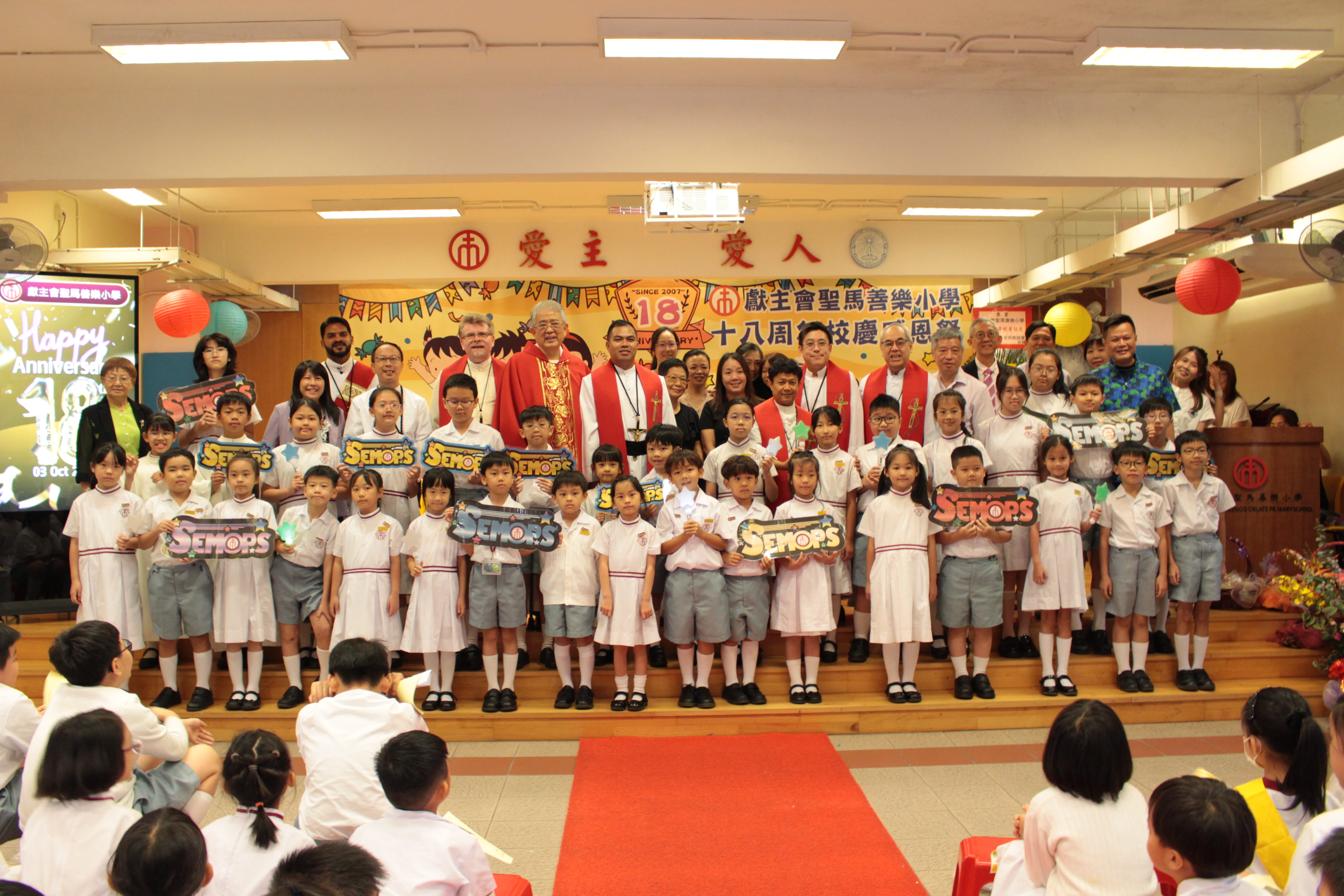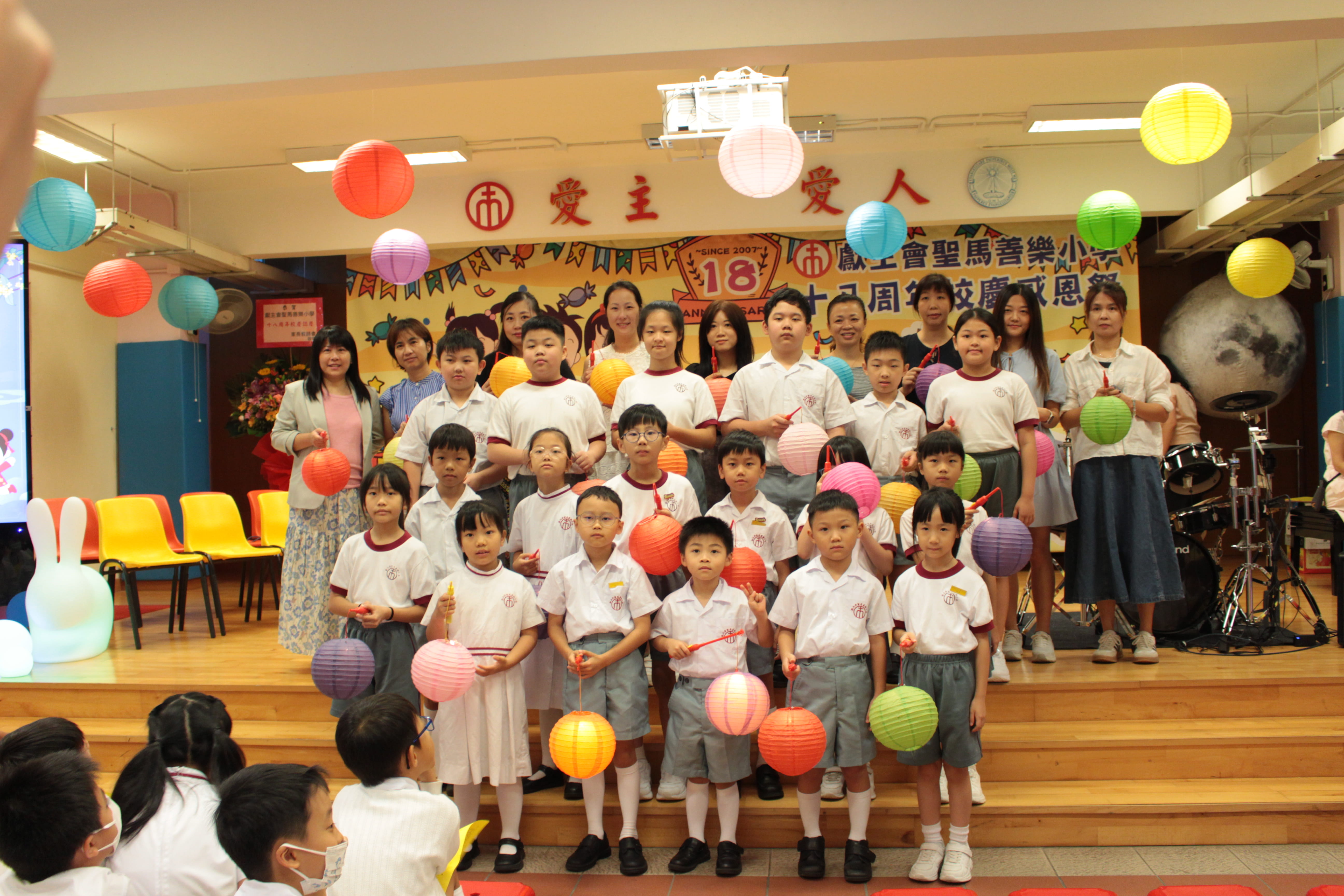 全圖寓意歡欣雀躍的小朋友在獻主會聖馬善樂小學內,