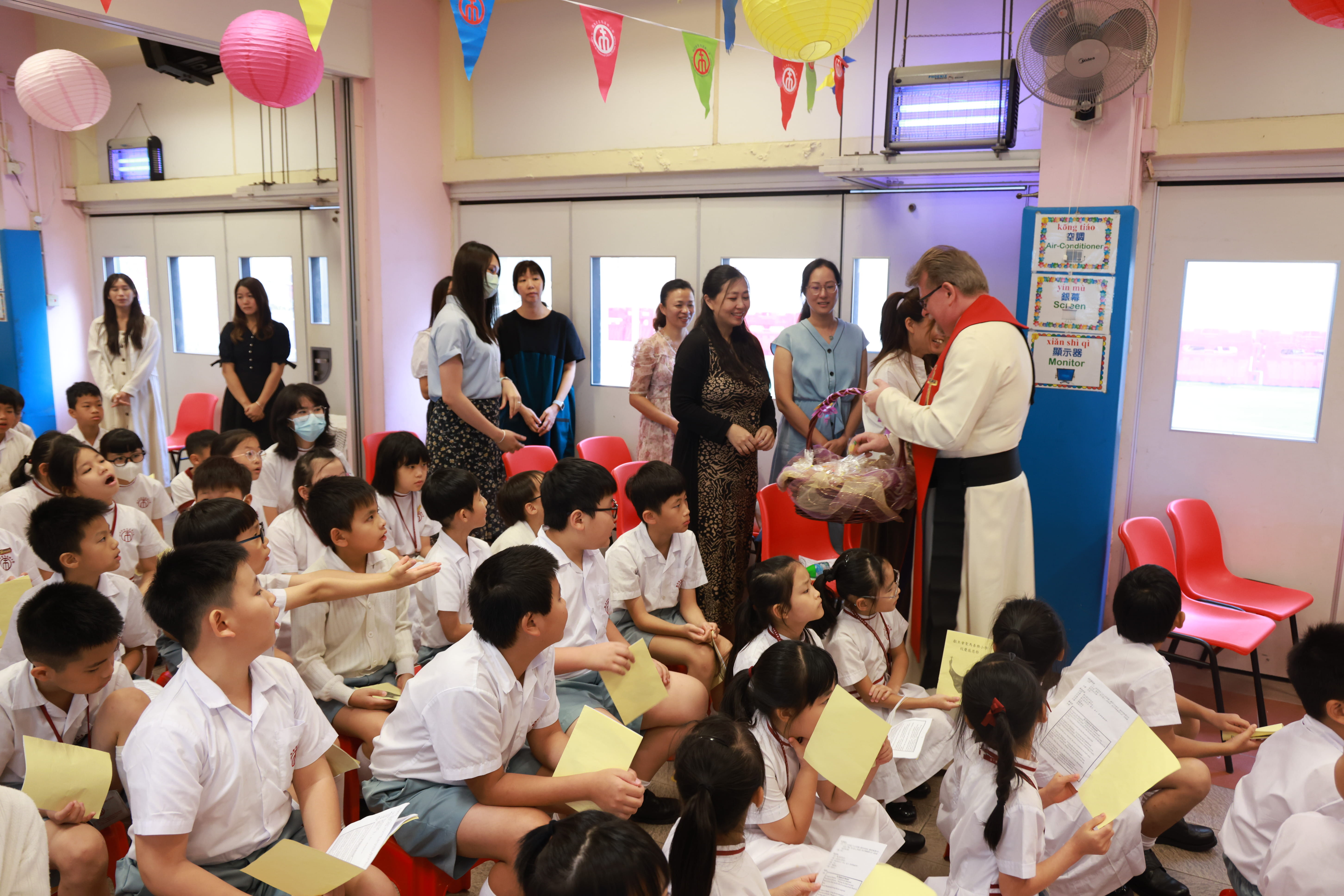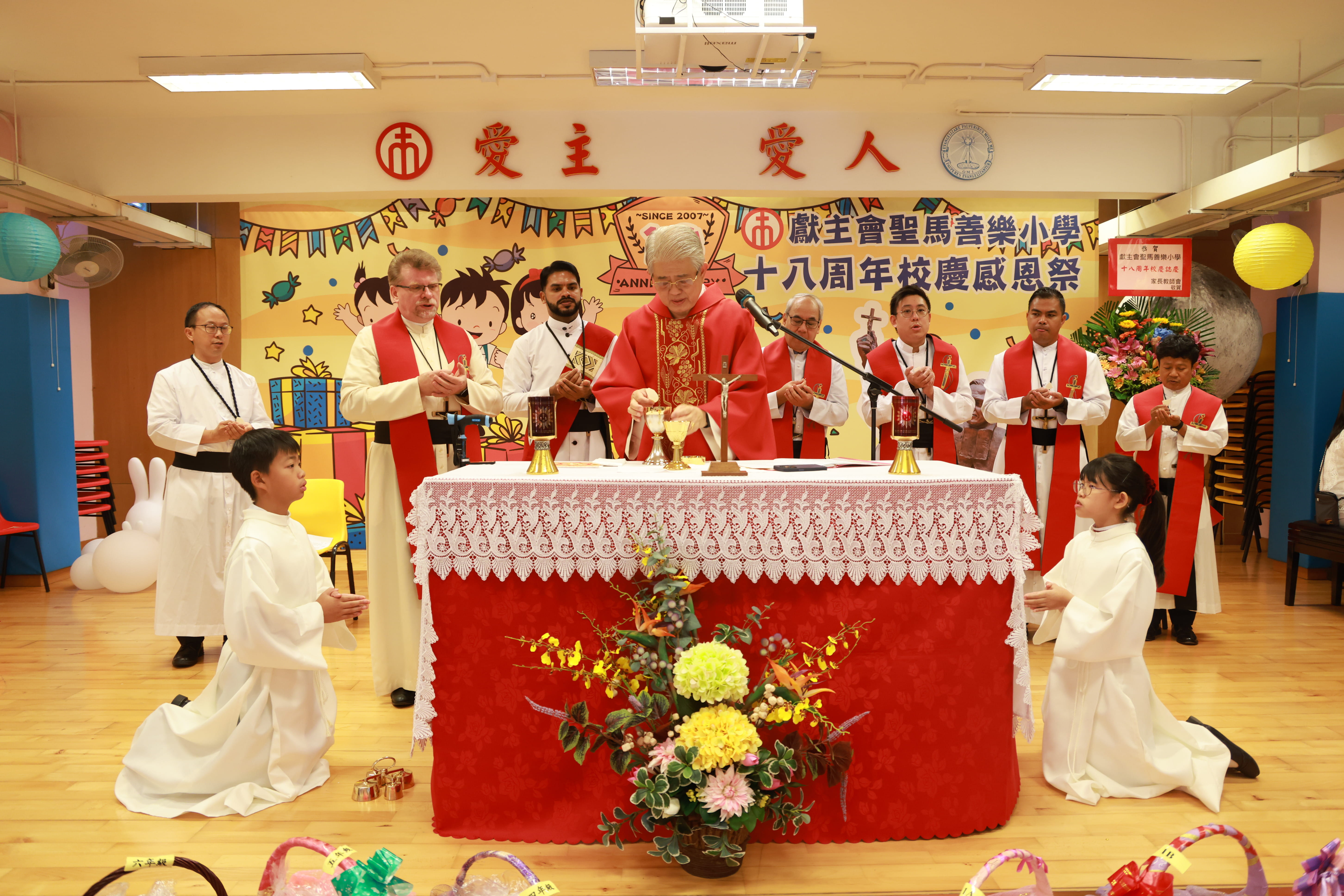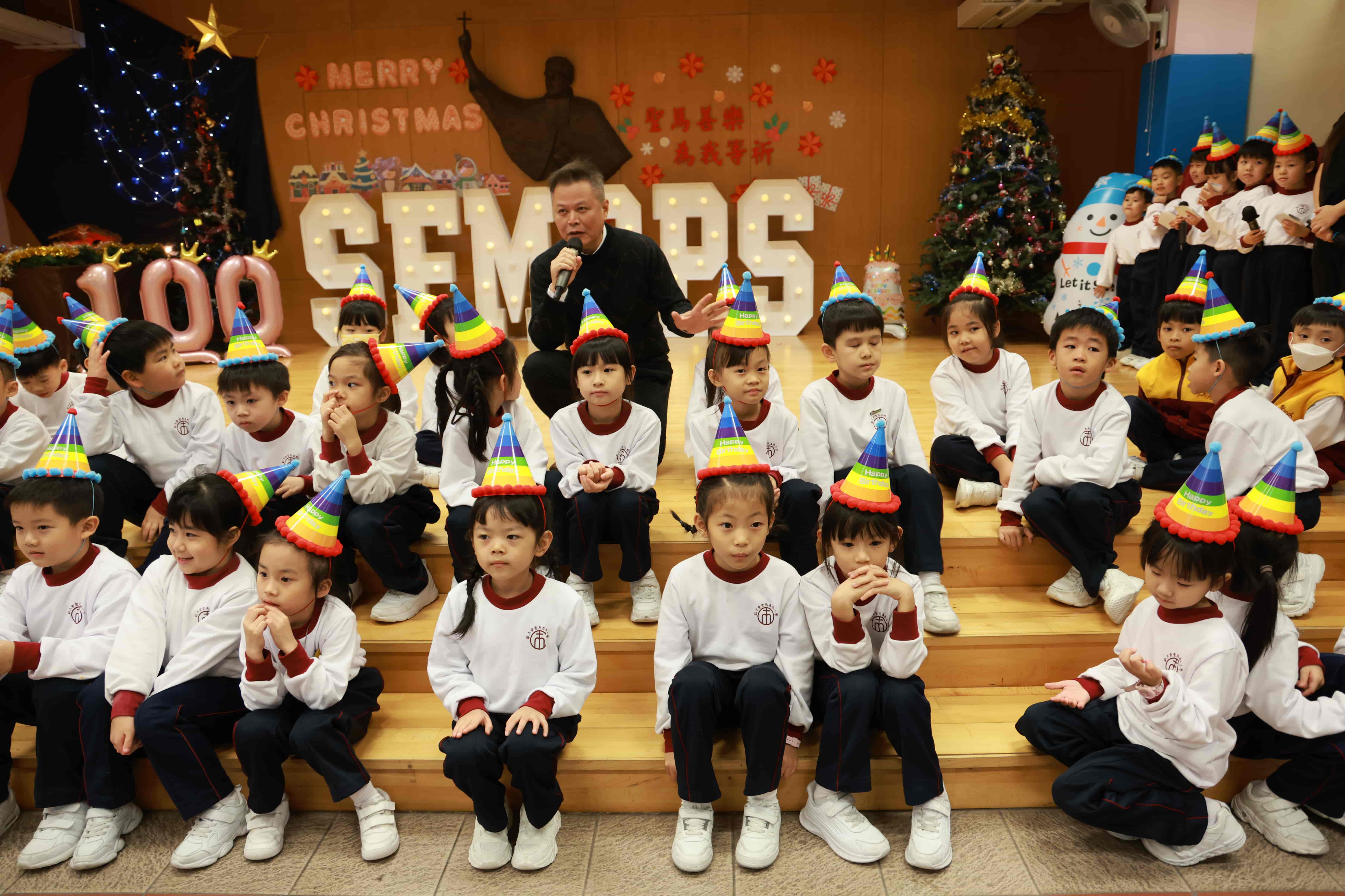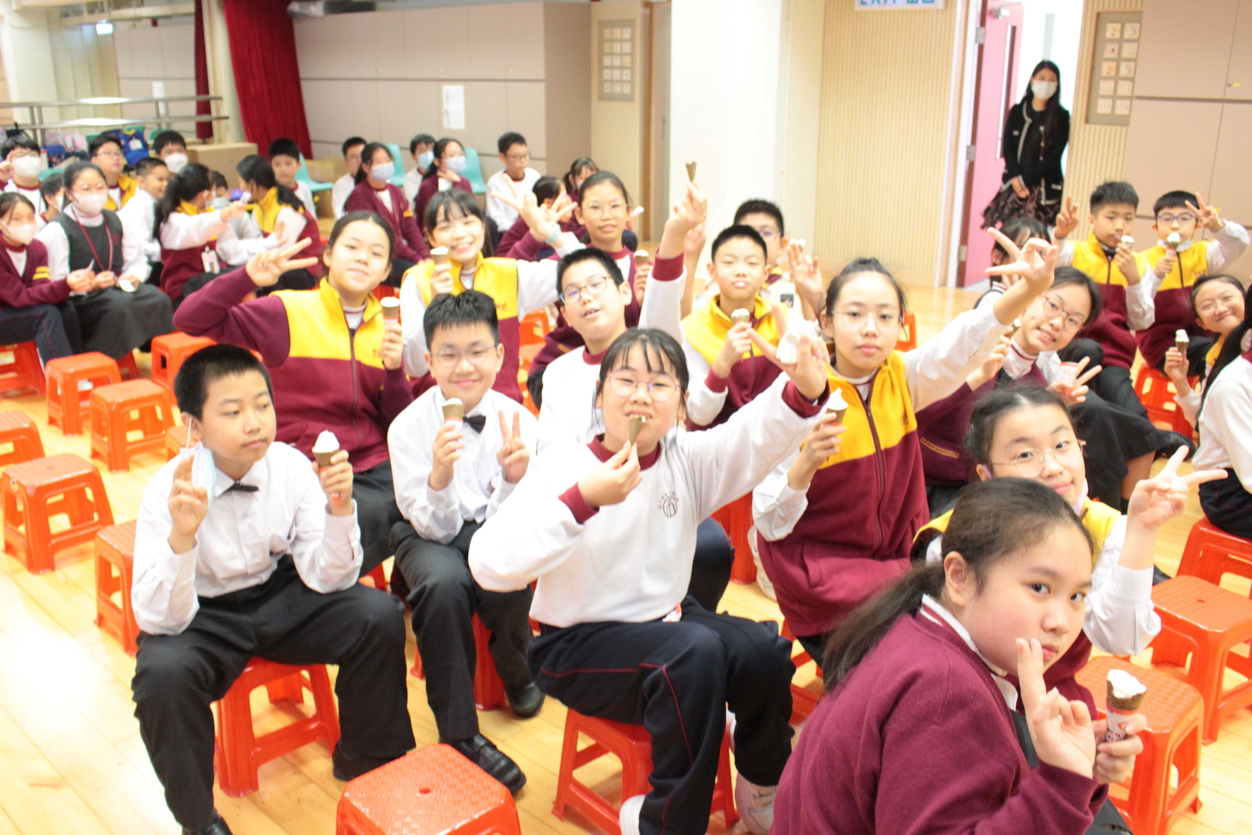 全圖寓意歡欣雀躍的小朋友在獻主會聖馬善樂小學內,